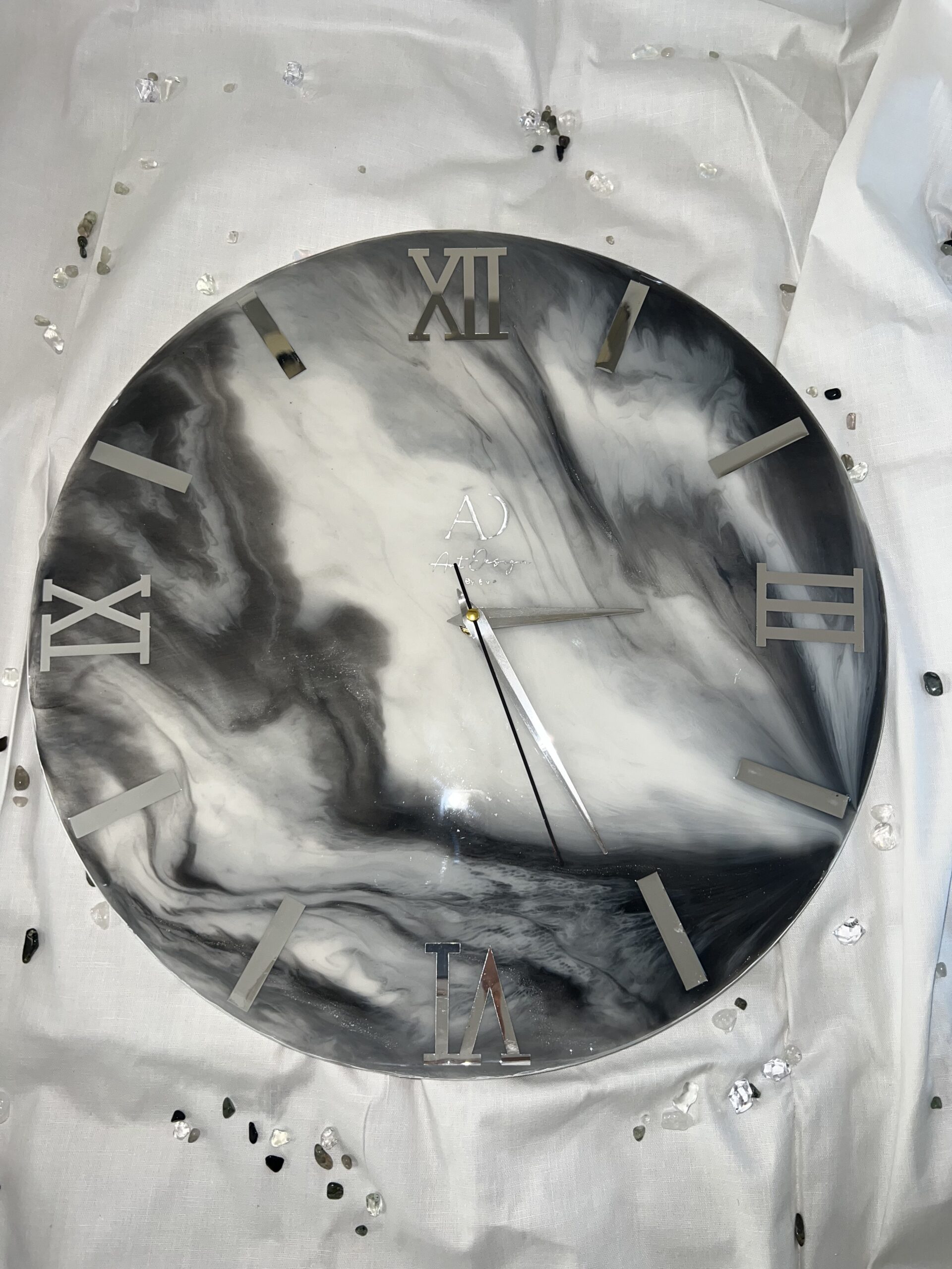 Les extrémités sont travaillées comme des rochers noirs, avec un effet de vagues sculptées ou suggérées, créant du relief et un contraste élégant. Les chiffres romains noirs s’intègrent parfaitement au design pour une lisibilité optimale.