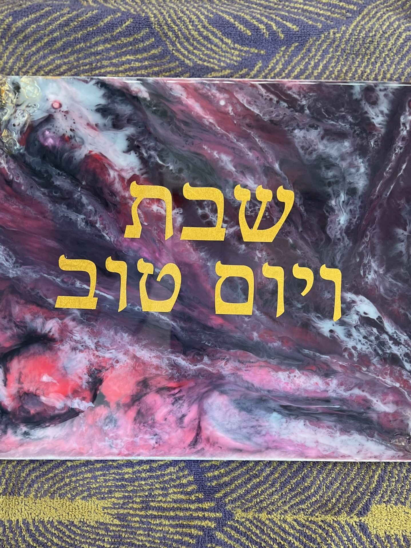 Horloge artisanale entièrement faite main, réalisée en résine époxy avec un dégradé harmonieux de violet, perle et rose, sublimé par des touches dorées apportant lumière et élégance.
