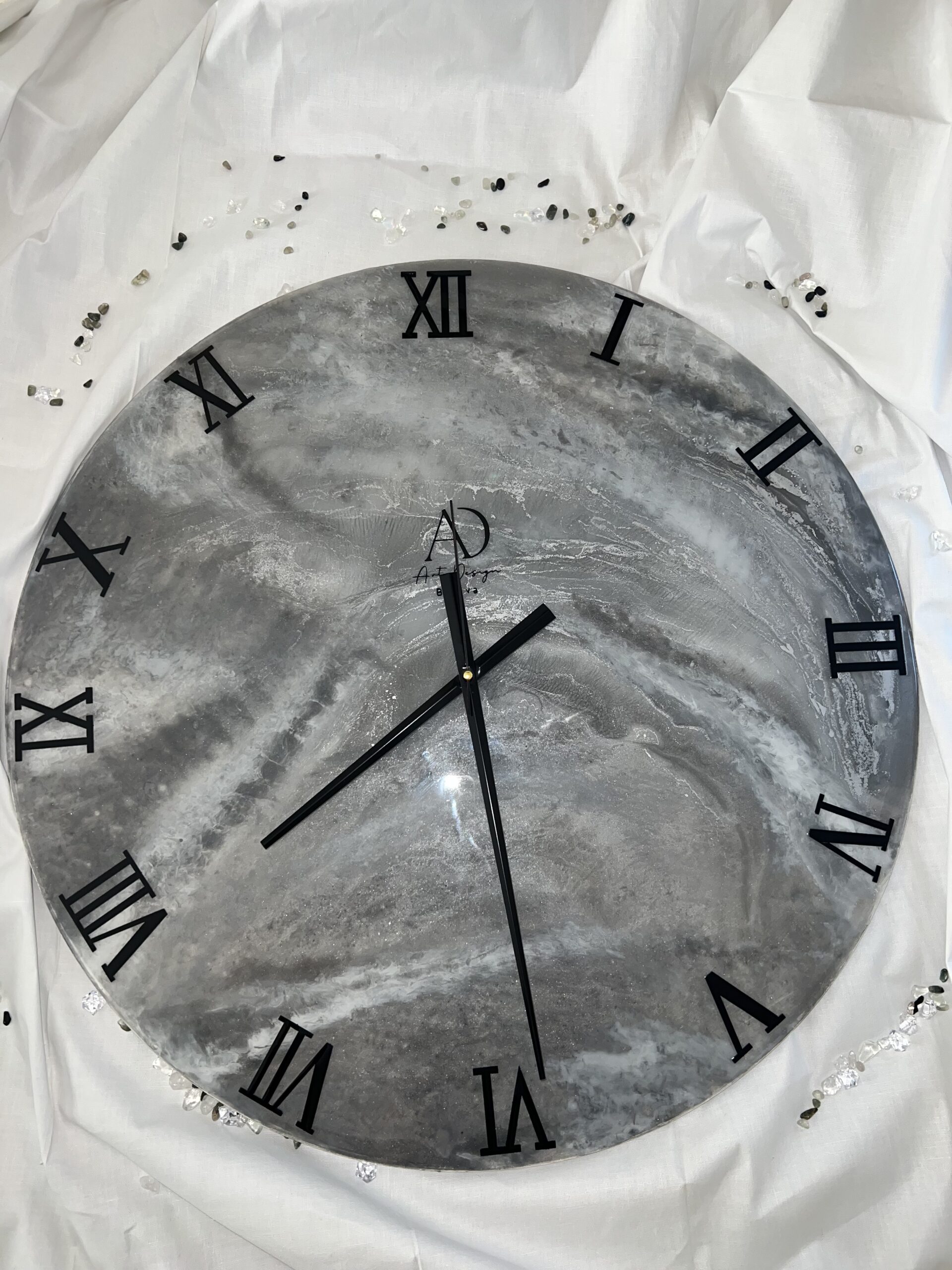 Horloge murale artisanale en résine époxy marbrée gris avec chiffres romains noirs, mécanisme silencieux, entièrement fait main. שעון קיר בעבודת יד מאפוקסי, בגוון שישי אפור עם ספרות רומיות שחורות, מנגנון שקט, עשוי בעבודת יד.