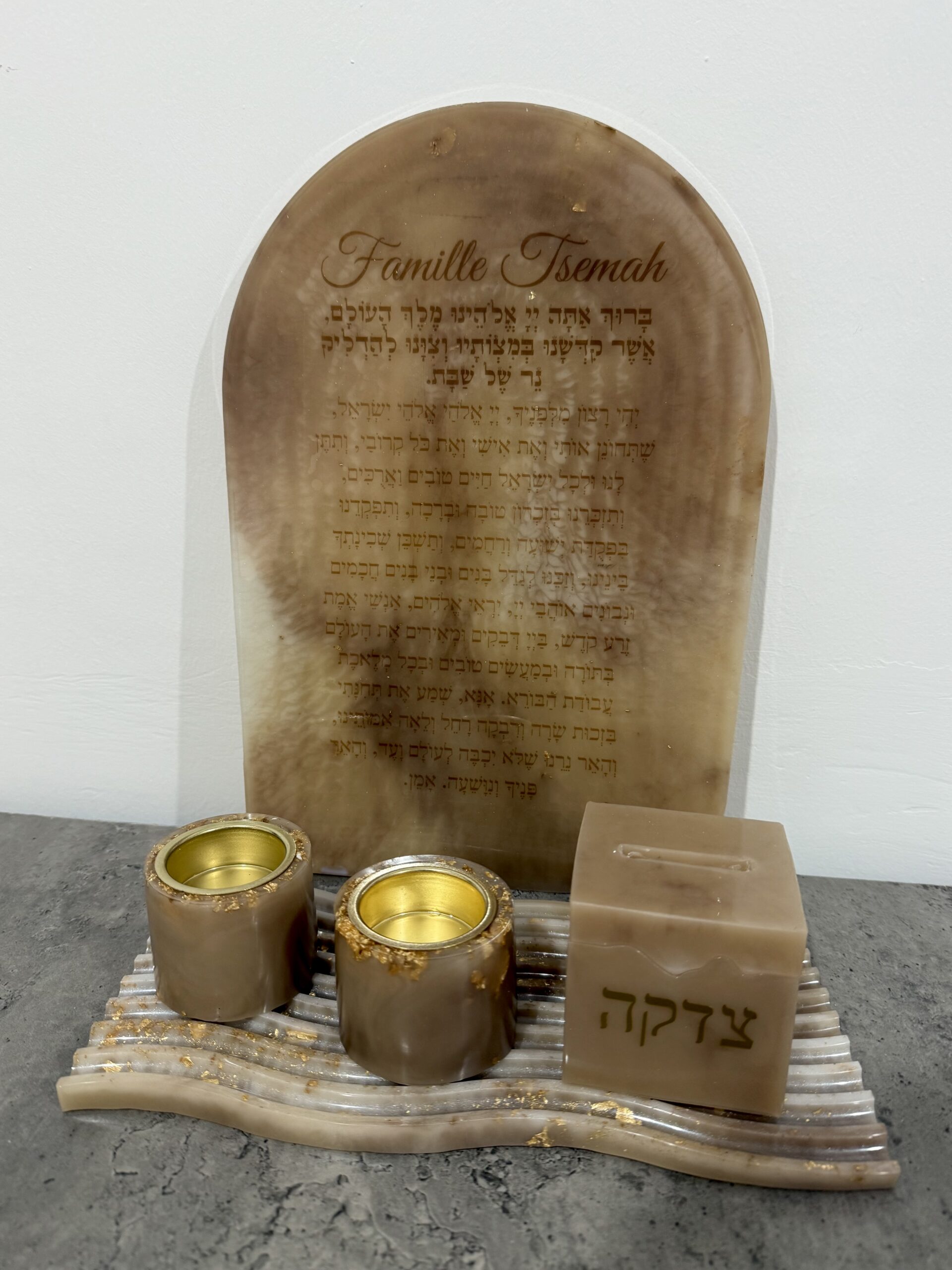 Le plateau présente 2 bougeoirs accompagnés d’un petit pot de tzedaka, ainsi qu’une cloche pour protéger la flamme. Le tout est décoré avec des tons harmonieux de marron, beige et perle, apportant chaleur et élégance. Au centre, le nom de la famille est écrit avec soin, personnalisant cette pièce unique.