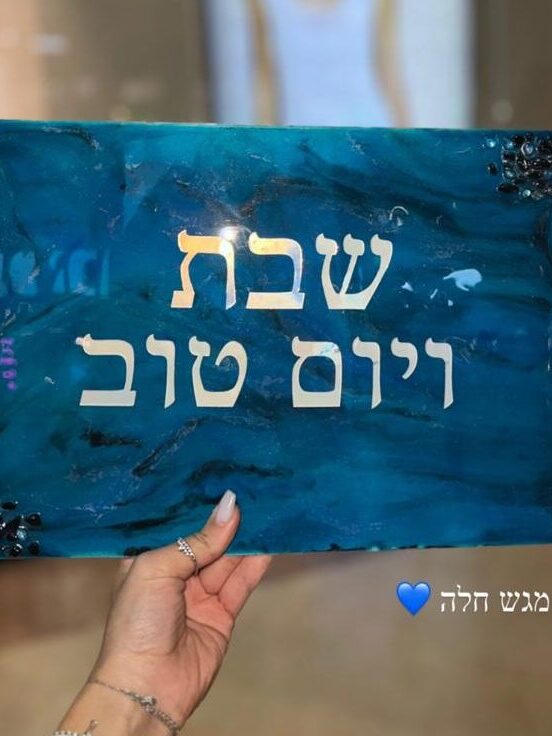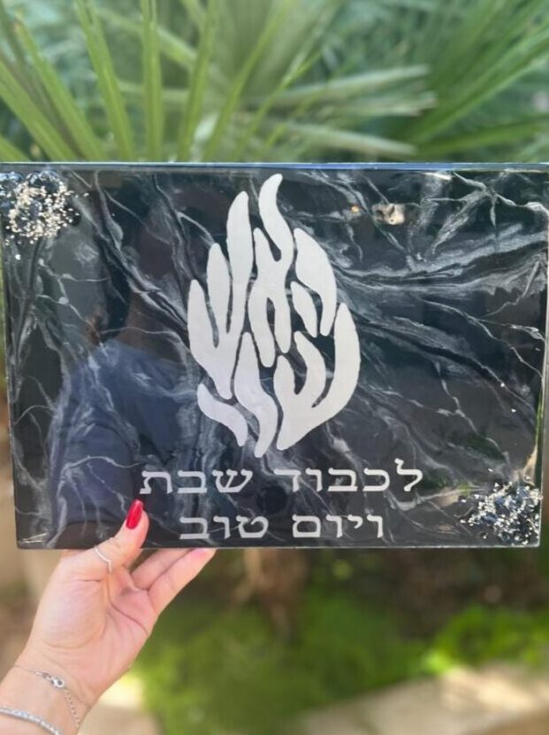 Ajoutez une touche d’élégance à votre table de Shabbat avec ce plateau unique. Fabriqué à partir d’une base en bois et recouvert d’une résine époxy vibrante aux couleurs envoûtantes, il crée un effet visuel captivant. L’inscription « Aesh Sheli » apporte une dimension spirituelle, rappelant la lumière et la chaleur de Shabbat. Ce plateau allie à la fois beauté, artisanat et fonctionnalité pour embellir vos repas de fête et vos moments précieux en famille.